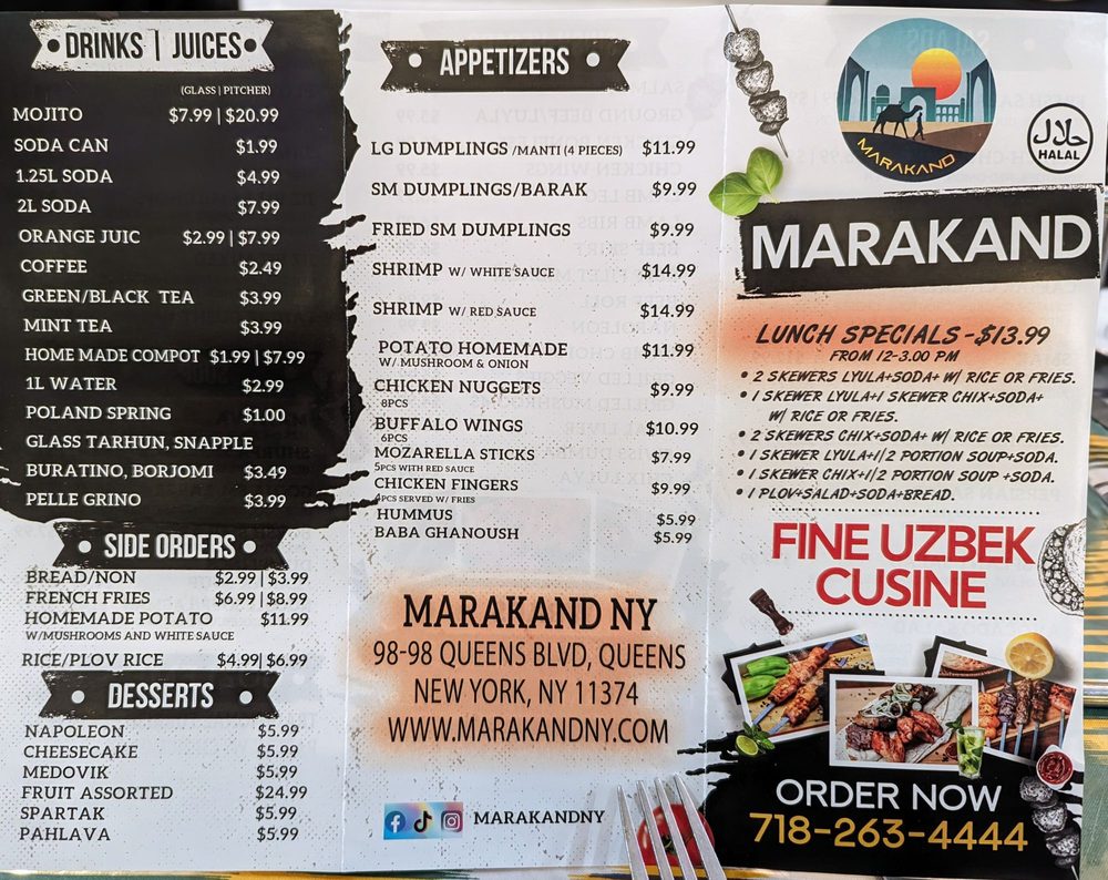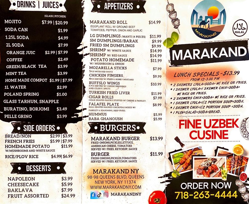 Welcome to Marakand, a hidden gem located at 9898 Queens Blvd in Rego Park, NY. This Uzbek restaurant offers a unique dining experience with a wide range of appetizers, drinks, and desserts that will tantalize your taste buds.
