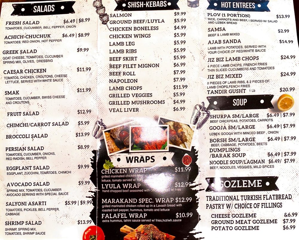 “ Who doesn't like Uzbeki cuisine?!?! I always jump at a chance to go for Uzbeki food, and so should you. What a treat! I have driven by this place so many times, and they always catch my eye. 12 of us ventured out to Marakand for the first time a few weeks ago, and we were pleasantly surprised! Service and hospitality were great; food was tasty and fabulous! Our menu (shared by 4 ppl): - Tandir Samsa ($3.49 each): these were phenomenal!! Filled with delicious seasoned lamb; fresh out of the oven and heavenly. But be careful because they're super HOT; don't burn your tongue! (5/5) - Barak ($9.99/small): these tiny boiled meat dumplings were delicious; especially with the side of sour cream. This was a simple dish but packed with flavor. (4/5) - Gozleme w.ground meat ($7.99): I though this was supposed to be a baked flatbread pizza-like dish, but what we got was more of a quesadilla-type dish. I was slightly disappointed but it was still pretty tasty. (3.5/5) - Persian Salad ($9.99): Basic cucumber, tomato & onions salad. Went really well with all our meat dishes. (3.5/5) - Plov ($14.99): Fantastic! The generous portion of lamb was tender and the rice with raisins & carrots were seasoned well. (5/5) - KEBABS: -----Luyla Kebab ($5.99/skewer): seasoned ground beef; alsoluted delicious! Recommended! (5/5) -----Lamb Rib Kebab ($6.99/skewer): a tad bit tough but tasty. (4/5) -----Lamb Leg Kebab ($6.99/skewer): Perfection! Recommended! (5/5) -----Beef Skirt Kebab ($6.99/skewer): Perfection! Recommended! (5/5) I would definitely return to Marakand to try their other dishes and Kebabs! Good for large groups but I recommend making reservations. They have a huge menu to explore, and I look forward to a return visit soon! Note that this is a Halal establishment; absolutely no liquor allowed. ”
